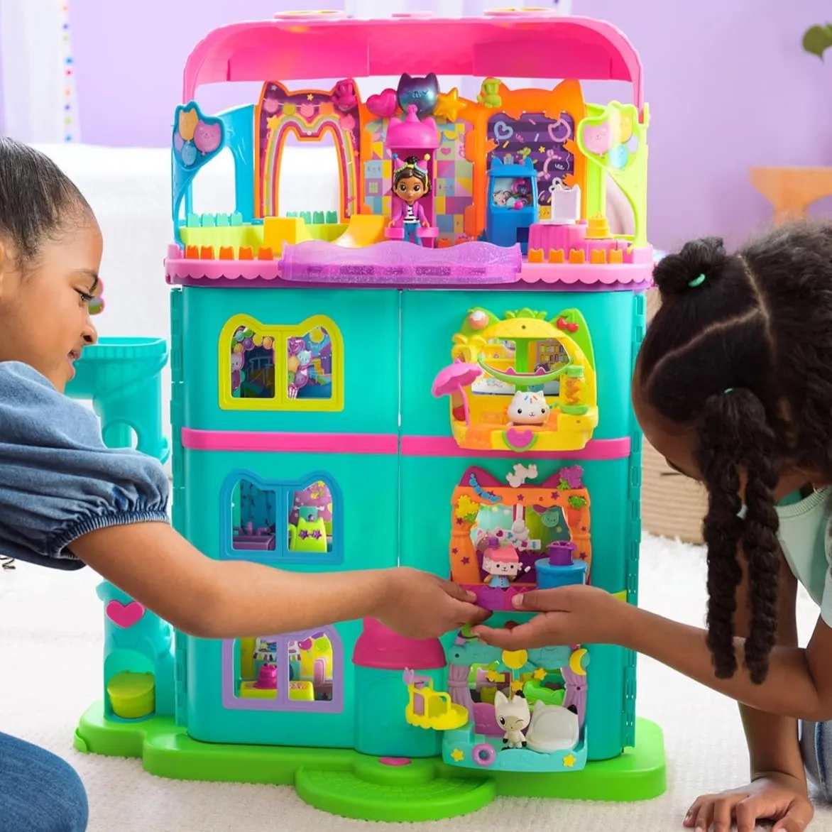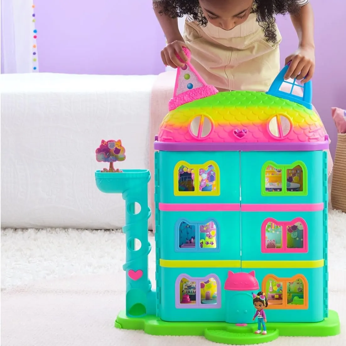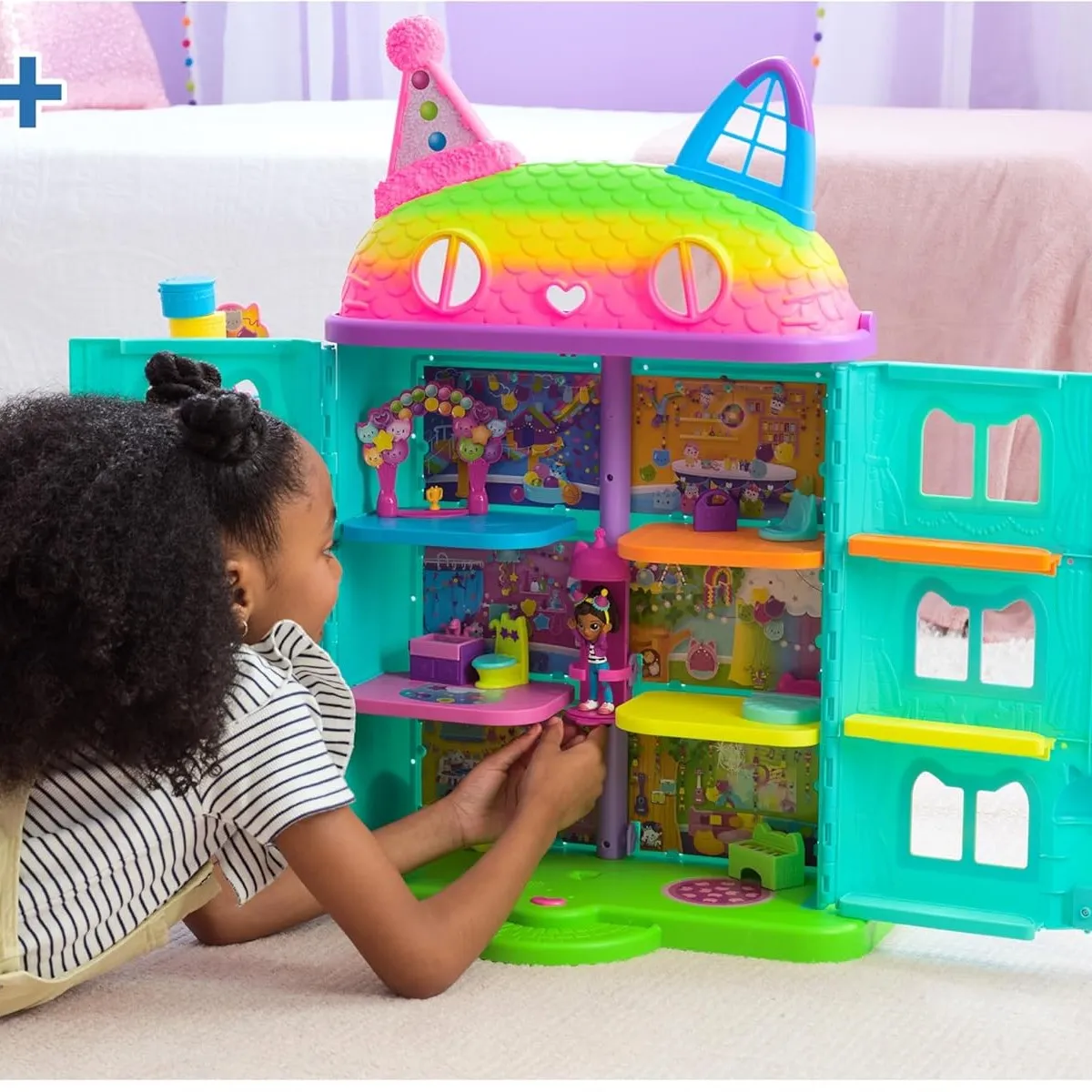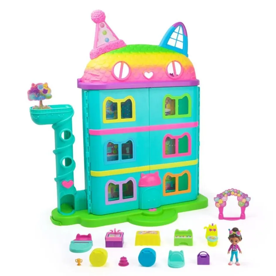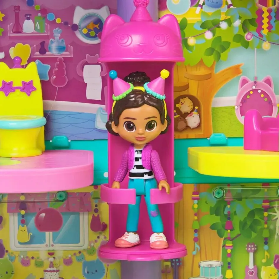 Gabby's Dollhouse Celebration Purrfect Dollhouse djecu vodi ravno u Gabbyin čarobni svijet. Šest šarenih soba, funkcionalno mačje dizalo, krovno igralište i zvukovi iz serije omogućuju beskrajne priče i zabavu. Set sadrži Gabby, DJ stol, luk od balona i iznenađenja za maštovite igre.