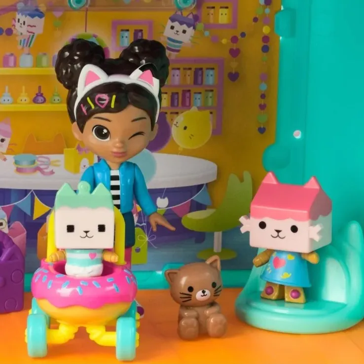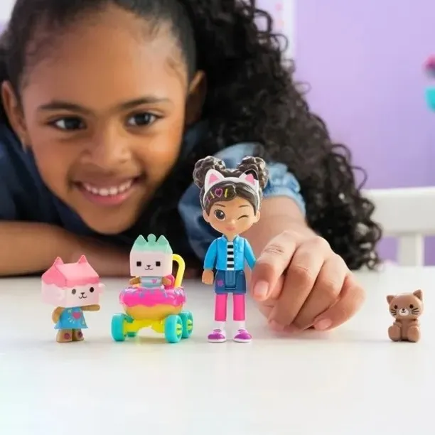Set figurica Gabby's Dollhouse s bebama vodi djecu ravno u Gabbyin čarobni svijet. S Gabby, mamom Mačkom i bebom Benijem te kolicima u obliku donuta mogu smišljati vlastite priče o brizi. Iznenađenje u obliku mede i QR kod donose još više zabave i svaka igra postaje nova priča.