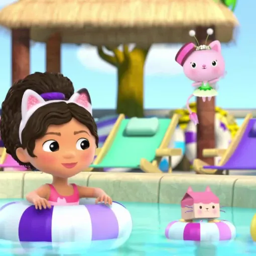 Zamišljamo sunčanu bazensku zabavu, Gabby i Mercat jure niz tobogan, njihovi repići mijenjaju boju, a svako prskanje donosi smijeh i nova otkrića.
