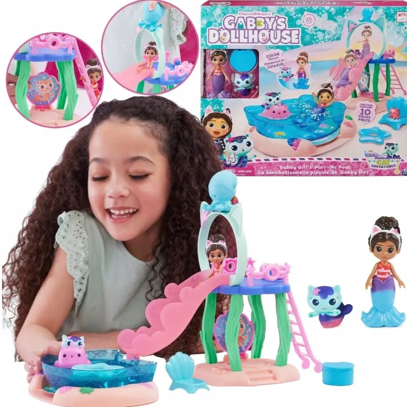 Bazenski set Gabby’s Dollhouse prenosi djecu u svijet crtića - prava tobogan, Gabby i Morska Mačka mijenjaju boju repa, a tu su i skrivena iznenađenja. Djeca mogu izvoditi omiljene scene, smišljati vlastite pustolovine i povezivati set s drugim iz serije.