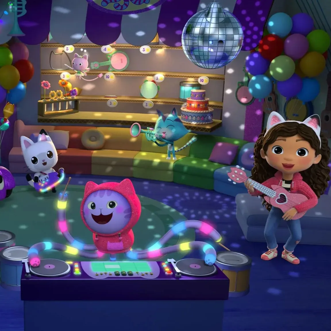 U blistavoj glazbenoj sobi Gabby svira ukulele. „Spremni za mačkasti jam, ekipo?” Pandy Paws vrti ploču: „DJ Pandy je ovdje!” Kitty Fairy zvoni tamburinom, a Cakey uzvikuje: „Ispecimo valove ritma!” MerCat uzima mikrofon. „Zablistajmo kućicu našim Party Parade nastupom!”