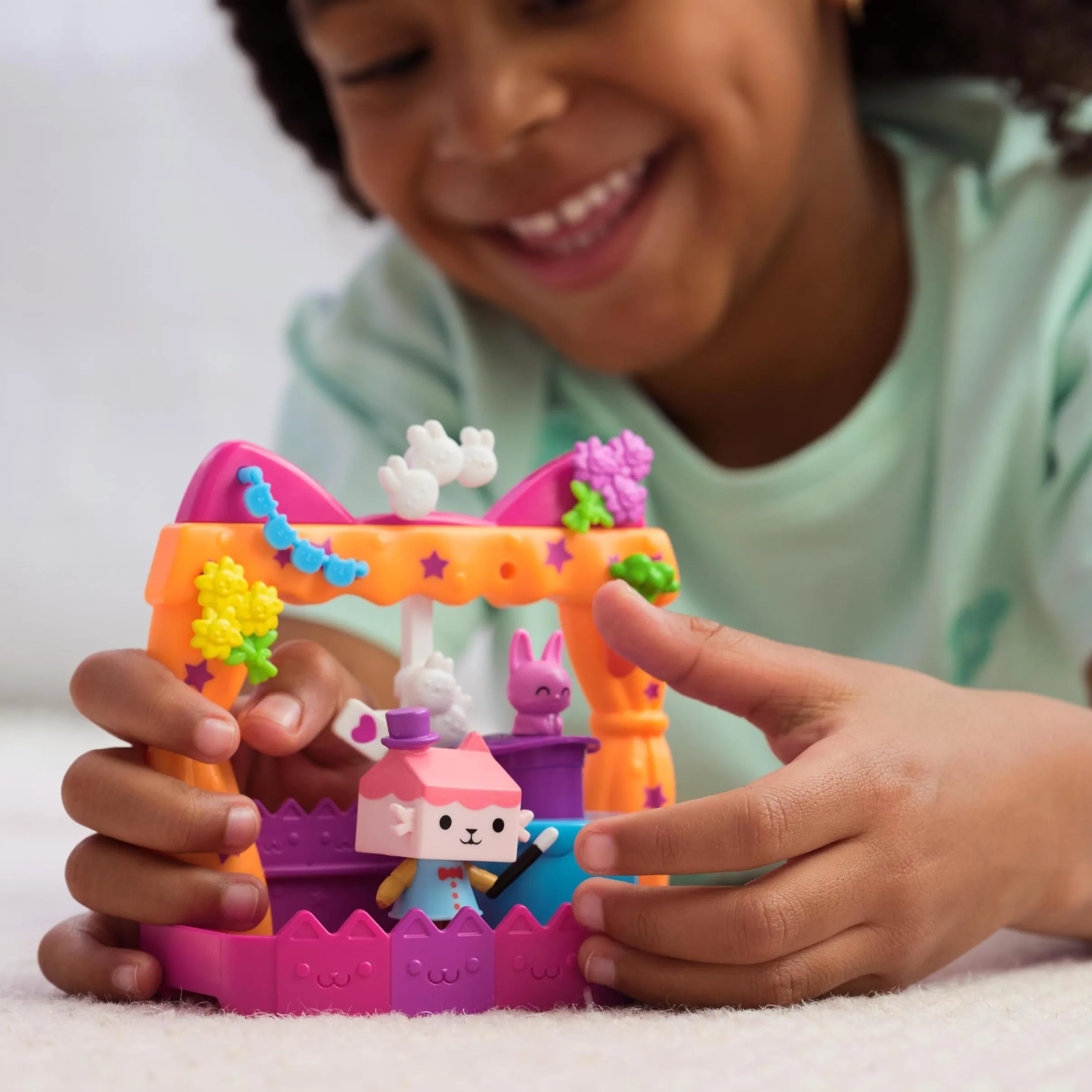 Ovaj čarobni set s balkonom donosi avanture Gabbyine kućice u šarenu, kompaktnu scenu. Djeca mogu organizirati vlastiti talent show s preslatkom figuricom Baby Box i šest dodataka - poput čarobnog šešira i privjesaka - za beskrajne nastupe i priče. Male dimenzije savršene su za igru bilo gdje.