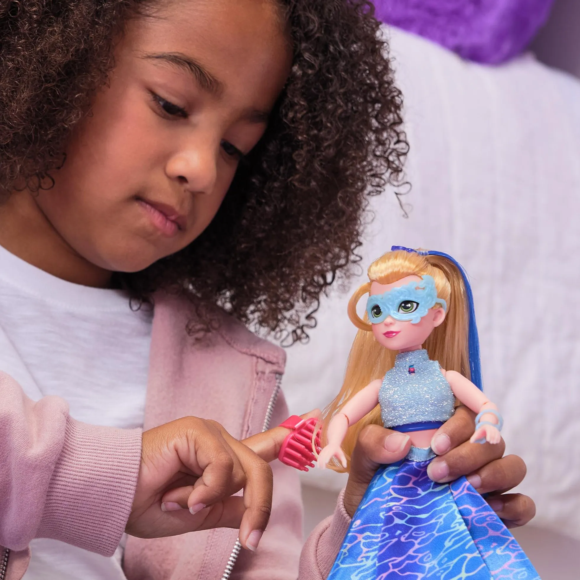 Lutka visoka 24 cm dizajnirana je za male ruke i izrađena od kvalitetnih materijala za sigurnu i dugotrajnu igru. Odjeća i maska se lako skidaju, a čišćenje je jednostavno blagim sapunom i vodom. Svi detalji zadovoljavaju stroge sigurnosne norme.