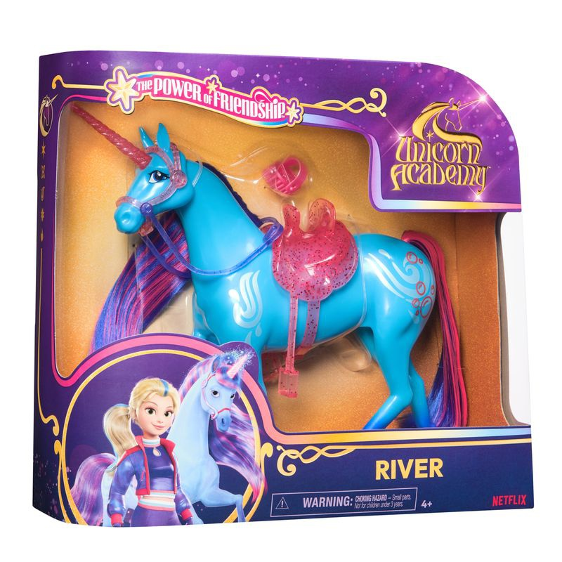 River iz Unicorn Academy čarobni je jednorog za češljanje inspiriran Netflix serijom i popularnim knjigama. Ima sjajan rog, vodene čarobne detalje i dugu grivu i rep za češljanje, što potiče stvaranje vlastitih priča. Pokretna glava i odvojivo sedlo otvaraju beskrajne mogućnosti igre s lutkama.