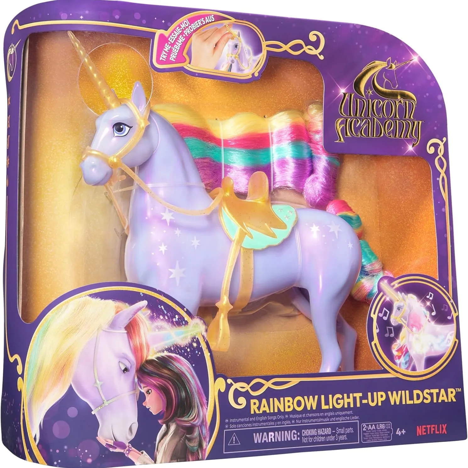 Unicorn Academy Wildstar je figura jednoroga visoka 24 cm, inspirirana čarobnom Netflix serijom i popularnim knjigama. Njegova meka, češljiva griva i pomična glava oživljavaju svijet Otoka jednoroga, pozivajući na beskrajne pustolovine i priče o prijateljstvu. Djeca mogu zamišljati čarobne zadatke i herojska spašavanja sa svojim omiljenim jednorogom.