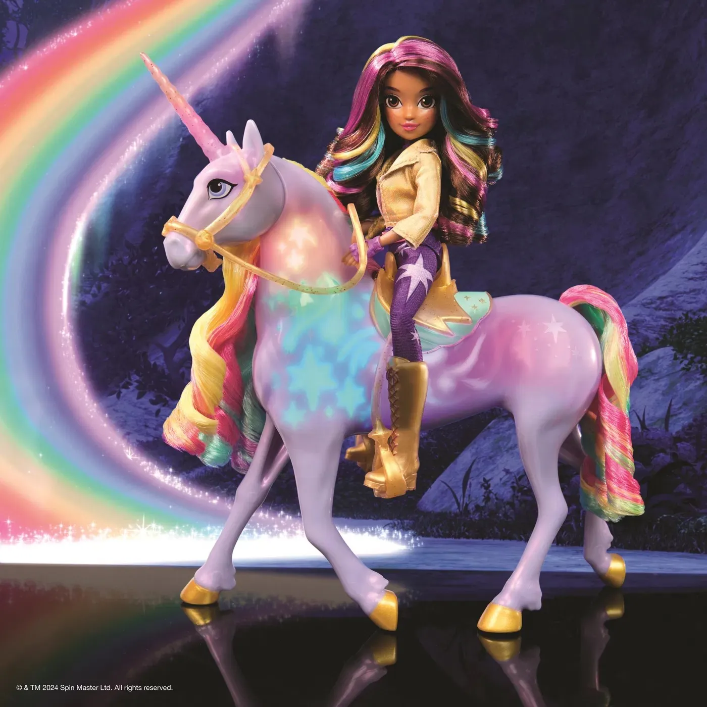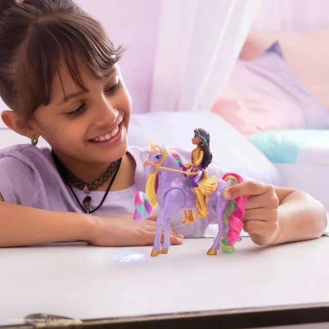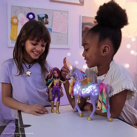 Unicorn Academy svjetleća Wildstar i Sophia set donosi magiju Netflix crtića u vaš dom. Wildstar svijetli duginim bojama i svira glazbu kad joj dodirnete lice ili rog, a povlačenjem uzdi čuju se zvuci galopa. Sophia može jahati Wildstar, što djeci omogućuje da prožive čarobne pustolovine iz crtića.