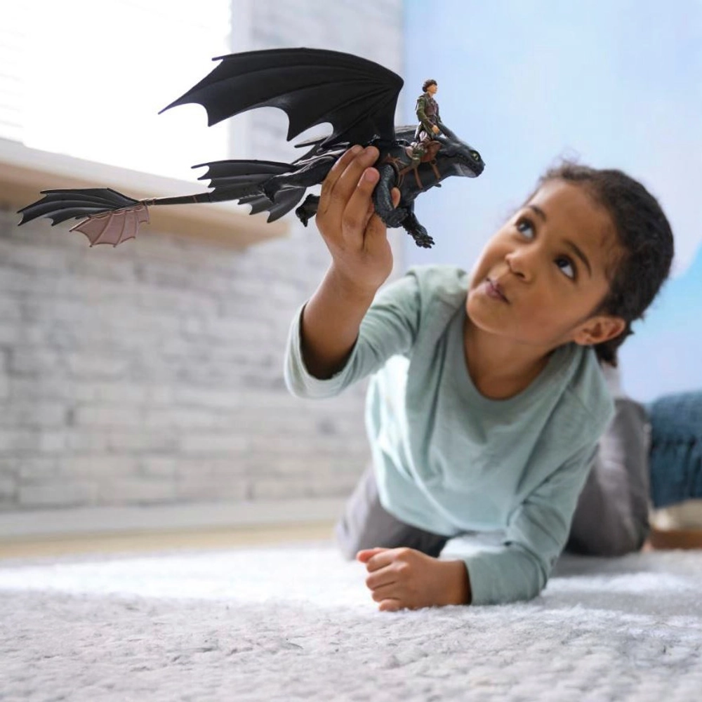 Ovaj službeni DreamWorks set donosi čaroliju Kako izdresirati zmaja ravno u dječju sobu – s velikom figurom Bezubice i njezinim hrabrim vikingom Štuckom. Bezubica ima prava savitljiva krila, pomičnu čeljust i noge, a Štucko sigurno sjedi na leđima za zračne i borbene avanture. Djeca mogu ponovo proživjeti filmske scene ili izmisliti vlastite zmajske priče.