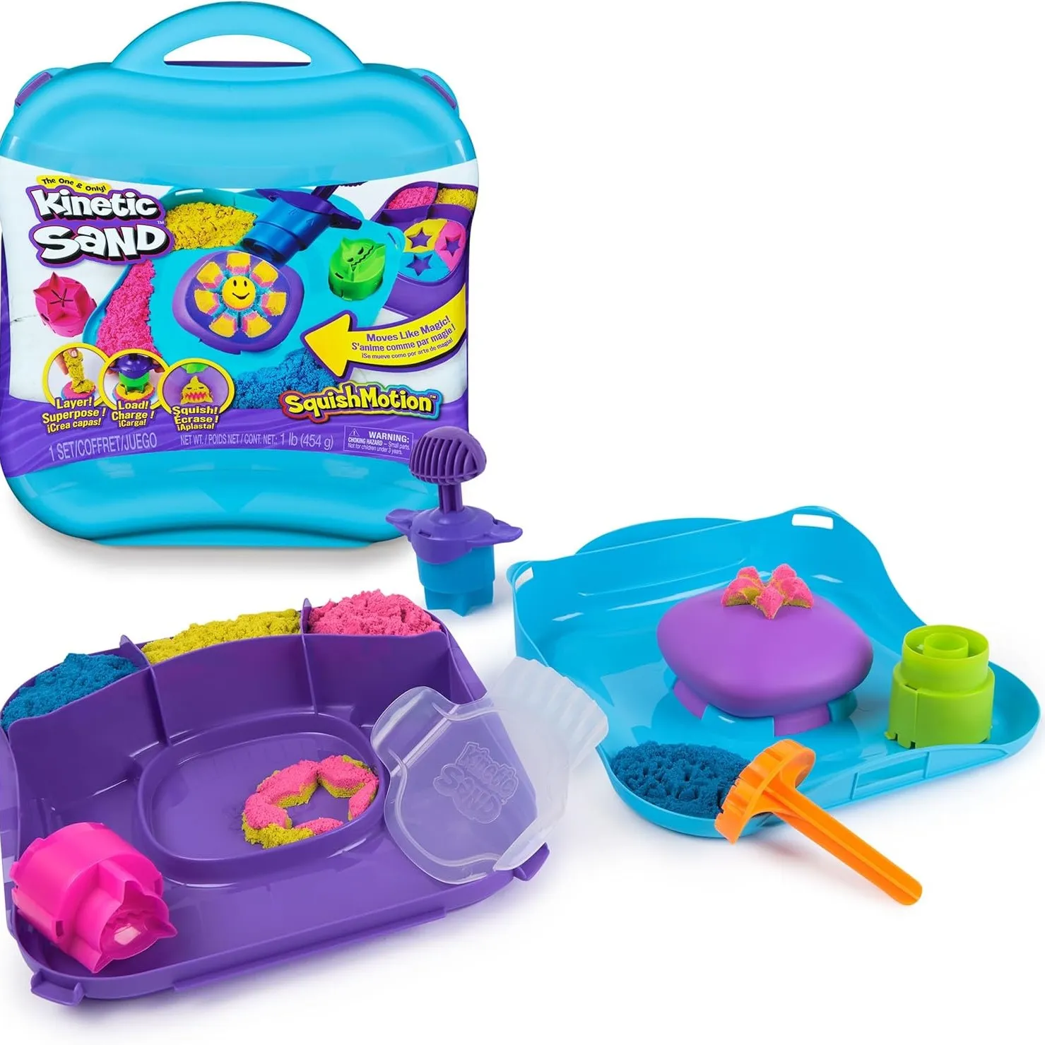Kinetic Sand SquishMotion set omogućuje djeci gnječenje, žigosanje i oblikovanje tri žive boje pijeska u pokretne oblike. Uz zabavne alate i posebnu pjenu, morski psi, sunca i zvijezde „ožive” na svaki pritisak. Pijesak nikad ne presuši pa je svaki dan nova pustolovina.