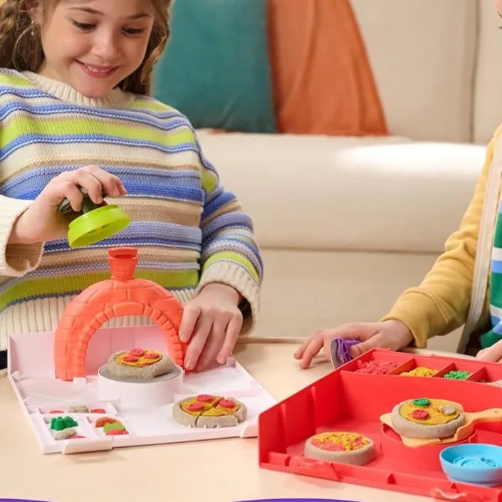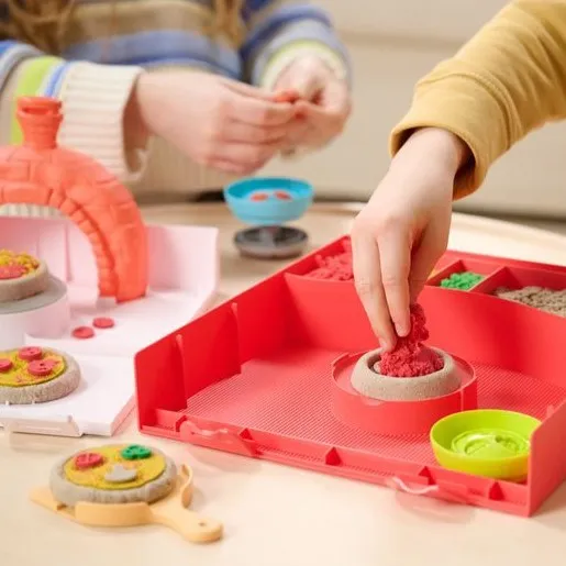 Kinetic Sand Pizza set omogućuje djeci da naprave vlastite pizze od šarenog, gnjecavog pijeska. Kalupima mogu oblikovati salamu ili povrće, tijesto stisnu da naraste rub, a pravim alatima režu pizzu. Svaka pizza može biti posebna, mašti nema granica.