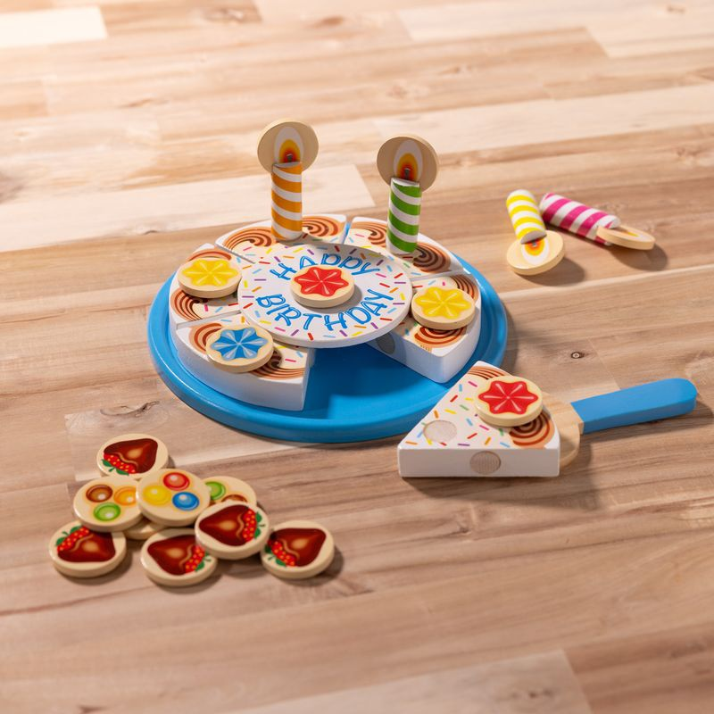 Drvena rođendanska torta Melissa & Doug omogućuje djeci da organiziraju vlastite proslave, režu tortu drvenim nožem i ukrašavaju je šarenim svijećama i dekoracijama. Čičak pri rezanju proizvodi zabavan zvuk, a set potiče dijeljenje i maštu kroz igru uloga.