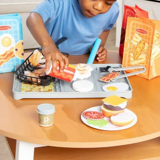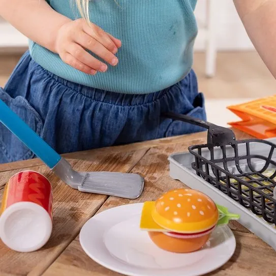Roštiljanje i prženje nikad nije bilo tako zabavno! Nahranite gladnu maštu s Melissa & Doug Water WOW! – igračkom hrane koja mijenja boje. Okrećite burger, povrtni burger ili palačinku na roštilju, iscijedite vodu iz lopatice i gledajte kako se hrana 'pekne' i mijenja boju! Dodajte vodu u fritezu, stavite pileće medaljone, lukove kolutiće i krumpiriće te ih 'ispržite' do hrskavosti! Poslužite s filcanim dodacima i pecivom za burger, koja kad se pokvase otkrivaju kečap ili senf. Poslužite, sortirajte i pohranite sve u zabavne platnene vrećice. Ostavite dijelove da se osuše i igrajte se ponovno i ponovno!Prikazati