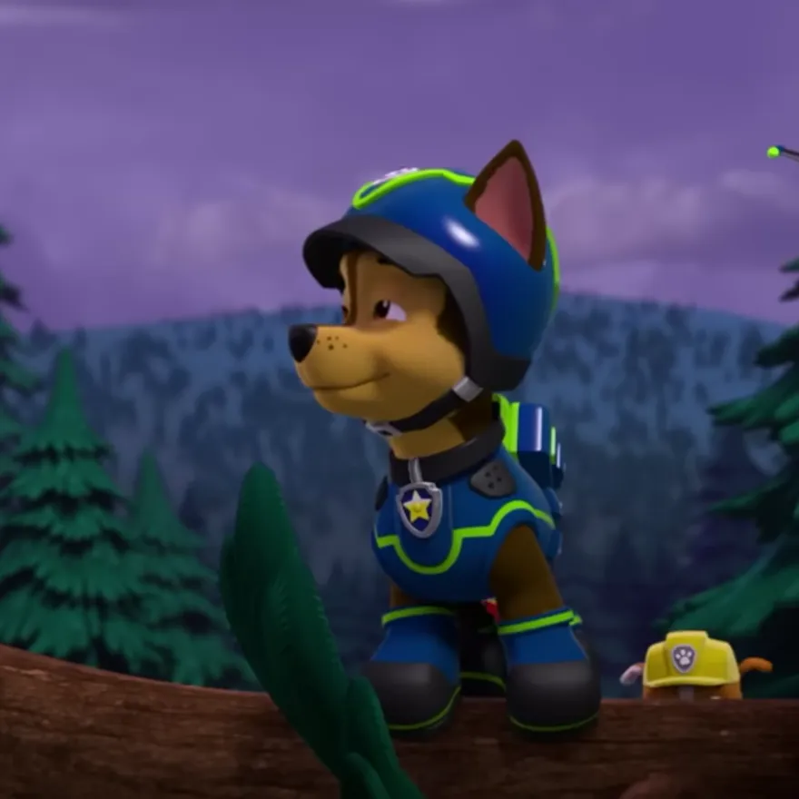 Među borovima, Chase stoji na palom deblu. „Rubble, vidiš li kartu?” Rubbleova žuta kaciga viri iz grma. „Našao sam je! Ali i… blato. Puno blata.” Chase se nasmije: „Malo blata nas neće zaustaviti!” Zajedno kreću vratiti izgubljenu kartu planinara prije mraka.