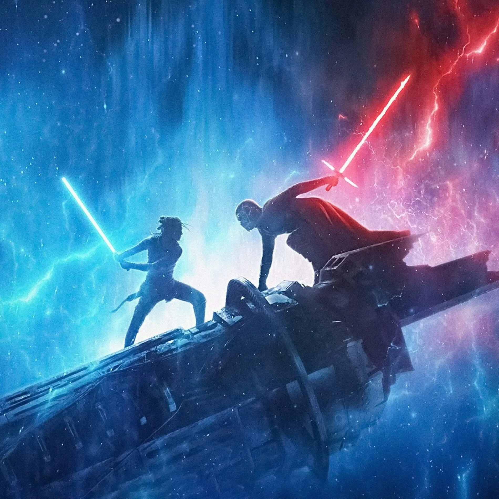 Na vrhu iskrivljenih olupina Rey čvrsto drži plavi mač. „Još se skrivaš iza maske, Kylo?” zove ona. Kylo Ren zamahuje plaštem: „Ne maske se trebaš bojati, Rey.” Oštrice sijevaju, iskre lete. „Pobjednik osvaja najbolji plijen u galaksiji!” smije se Rey. Sudbina Sile je na kocki.
